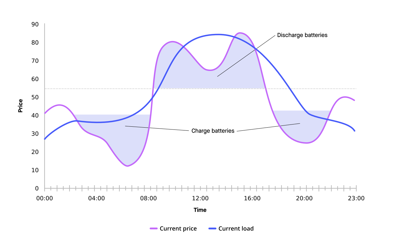 In the example below batteries are charged during off-peak hours and discharged to mitigate the peak when demand is high: